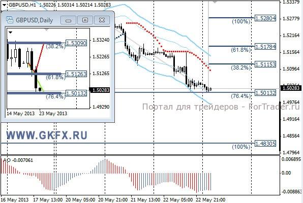 Пара GBPUSD продолжила снижение к новым минимумам с середины марта. Выступление Бернанке придало сил доллару и за счет этого снижение фунта ускорилось. По вчерашней рекомендации ордер не сработал. На этой неделе по традиции рассматриваю два варианта возможного движения цены, основной красный и альтернативный зеленый. Значимые уровни на сегодня отмечены на часовом графике. Индикатор АО находится в отрицательной зоне и растет, указывая на коррекцию перед возможным продолжением снижения. Индикатор тренда указывает на снижение. Sell из района 1,5040 со стопом 1,5055. Цель 1,5000. Не забываем ставить стоп в безубыток при первой же возможности.