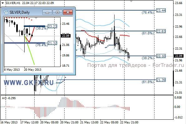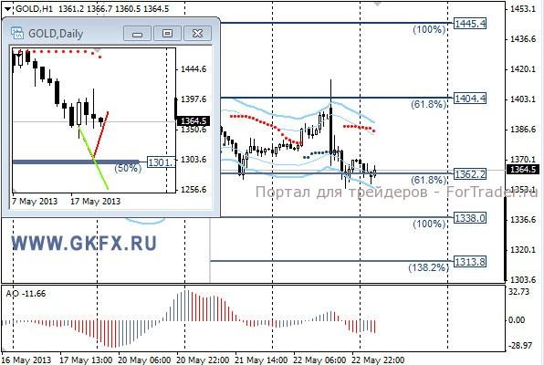 Цены на золото вчера снижались, и снижение может набрать новые обороты, так как индекс доллара вновь превысил отметку 84,00. Мало того не просто превысил, а начал уверенный рост, не давая шансов золоту вырасти в цене. Рост доллара случился после выступления председателя ФРС Бернанке, который обсудил возможность сворачивания программы по покупке облигаций. Этого и ждал рынок, любых намеков на частичное свертывание программы стимулирования экономики. Теперь по золоту рассматриваем только продажи. Традиционно делаю два варианта движения цены на неделю, основной красный и альтернативный зеленый. Значимые уровни на сегодня отмечены на часовом графике. Индикатор АО находится в отрицательной зоне и снижается, указывая на желание инструмента снижаться. Индикатор тренда указывает на снижение. Продажи с текущих уровней и выше. Стоп за 1390,0.