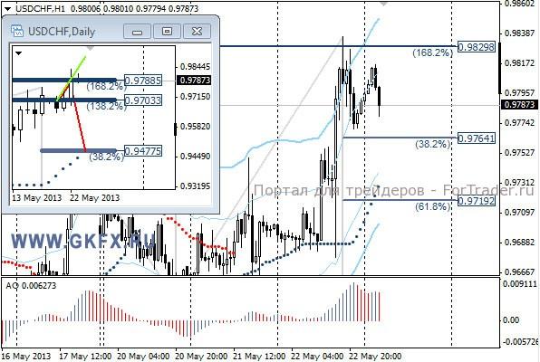 Пара USDCHF вышла из диапазона вверх и достигала максимумов с августа 2012 года. Повод для роста пары стало заявление президента Швейцарского национального банка Томаса Джордана о том, что он готов прибегнуть к мерам по дальнейшему ослаблению франка. Это направило пару вверх еще до выступления Бернанке. На этой неделе по традиции рассматриваю два варианта возможного движения цены, основной красный и альтернативный зеленый. Значимые уровни на сегодня отмечены на часовом графике. Индикатор АО находится в положительной зоне и снижается, указывая на коррекцию перед возможным продолжением роста. Индикатор тренда указывает на рост. Рассматриваем покупки из района 0,9740-60.