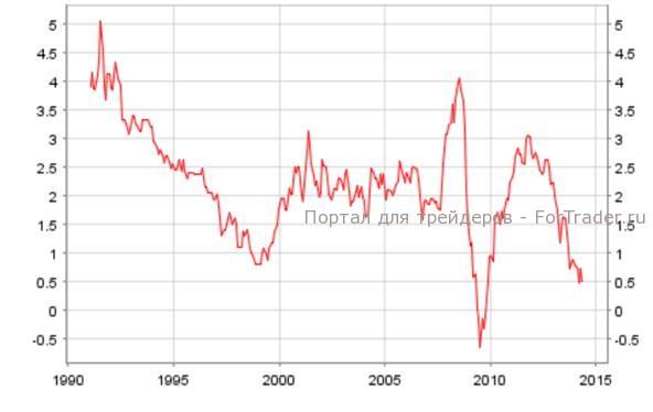 На столь радикальные меры ЕЦБ вынуждает ухудшение макроэкономической обстановки в еврозоне. Темпы роста ВВП еврозоны в 1 кв. 2014 года оказались хуже первоначального прогноза +0,4% (кв./кв.), составив +0,2%(кв./кв.). При этом за прошедший год потребительская инфляция в еврозоне снизилась с +1,6%(г./г.) до +0,5%(г./г.), оставаясь в 4 раза меньше таргетируемого ЕЦБ значения в 2,0% (г./г.). На снижение инфляционных ожиданий в еврозоне также указывает сокращение по итогам апреля на 1,2% (г./г.) индекса цен производителей еврозоны. В условиях развития дефляционных процессов в европейском регионе, экономические агенты вероятно отложат покупки промышленных товаров, намереваясь купить их в будущем по более низким ценам. Таким образом, на фоне вероятного расширения процентного дифференциала между USD и EUR, мы не исключаем тестирования парой EUR/USD отметки 1,3500.