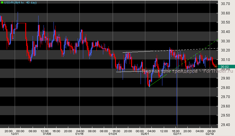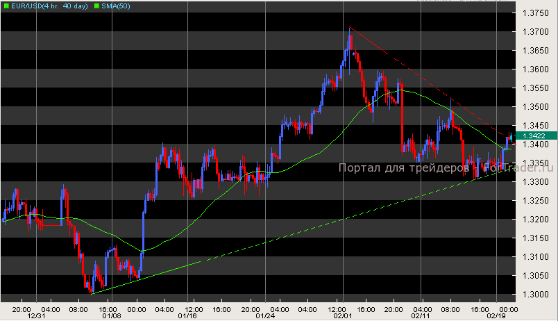 Данное движение обусловлено восстановлением доверия к европейским экономикам. Таким образом, индексы настроений в деловых кругах Германии и Еврозоны порадовали участников своими рекордными значениями еще вчера, а уже сегодня вышли неплохие данные по экономике Франции. Индекс делового доверия предпринимателей к экономике страны в феврале вырос до 90. Впрочем, несмотря на улучшение настроений и доверия, макроэкономические показатели продолжают падать и, скорее всего, быстрого восстановления Еврозоны мы не увидим. Поэтому вероятность снижения европейской валюты сейчас значительно выше продолжения роста. Первой целью снижения по-прежнему является 1,316.