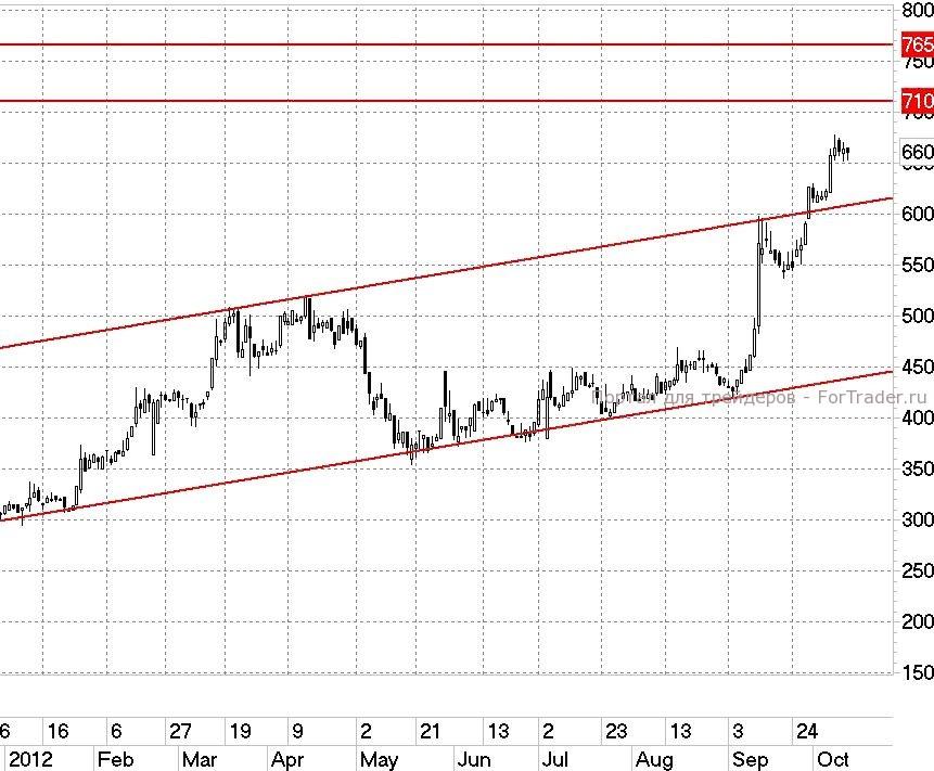 Оптимизм продолжает прибывать для компании Соллерс. Достаточно свободно был преодолен уровень 600 руб., это открывает новые рубежи. Судя по технике, ближайший таргет расположен на 710 руб., далее 765 руб./акцию