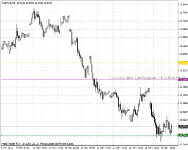 На часовом графике наблюдаем сильное нисхождение, пара импульсивно пробила локальную поддержку 31.23 пунктов. В данный момент происходит взятие следующей цели 30.79 пунктов, после чего возможна незначительная коррекция. Внутри дня рекомендуем держать короткие позиции, в краткосрочной перспективе так же ожидаем снижение.