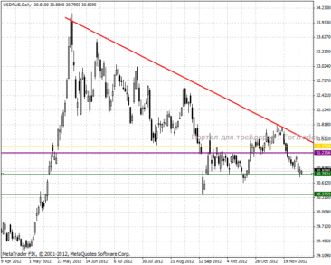 На дневном ценовом графике видим треугольную фигуру, в дальнейшем ожидаем продолжение нисходящей тенденции к нижней границе в отметке 30.37 пунктов. В среднесрочной перспективе ожидаем отскок от нижней границы фигуры и разворот тенденции с целью 32.56 пунктов.