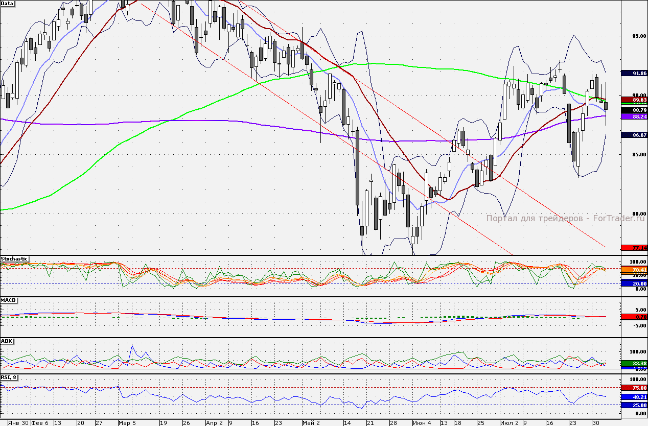 Акции Сбербанка закрылись в районе 10-дневной скользящей средней – 88,55 руб. Сопротивлением является отметка 90 руб., далее – 92,00 руб. Поддержкой является 200-дневная скользящая средняя – 88,24 руб.