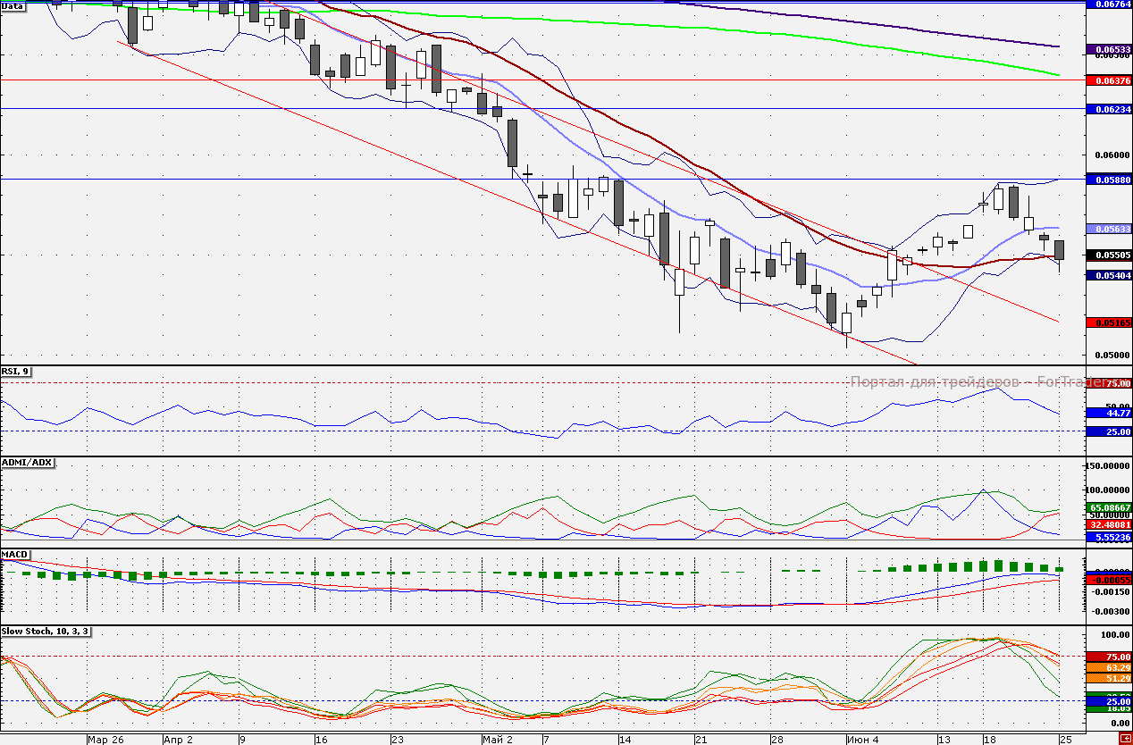 Акции ВТБ вновь закрылись в районе 21-дневной скользящей средней. Благодаря внешнему фону акции могут подняться к 10-дневной скользящей средней 5,633 коп. Поддержкой является 5,400 коп.