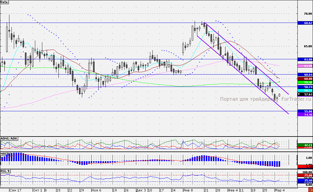Накануне акции НЛМК отскочили вверх от нижней границы нисходящего канала 56,30 руб., в котором бумаги торгуются с середины января текущего года. Кроме того, на графике акций образовалась свечная модель разворота тренда – «харами». Сегодня бумаги пытаются продолжить отскок. Показания трендовых индикаторов не исключают вероятности сохранения в ближайшее время позитивной динамики акций. Так индикатор ADMI/ADX показывает, что на смену «медведям» приходят «быки» (линия «медведей» снизу вверх пересекается с линией «быков». Также график индикатора RSI (9) стремиться покинуть зону перепроданности. Однако о развитии стремительно роста не стоит говорить до выхода бумаг из нисходящего канала, а пока спекулятивные «лонги» стоит закрывать от его  верхней границы, которая сегодня располагается на отметке 58,70 руб. Чуть ниже данного уровня проходит 10-дневная скользящая средняя. Наш 30-минутный торговый робот открыл длинные позиции от отметки 56,74 руб.