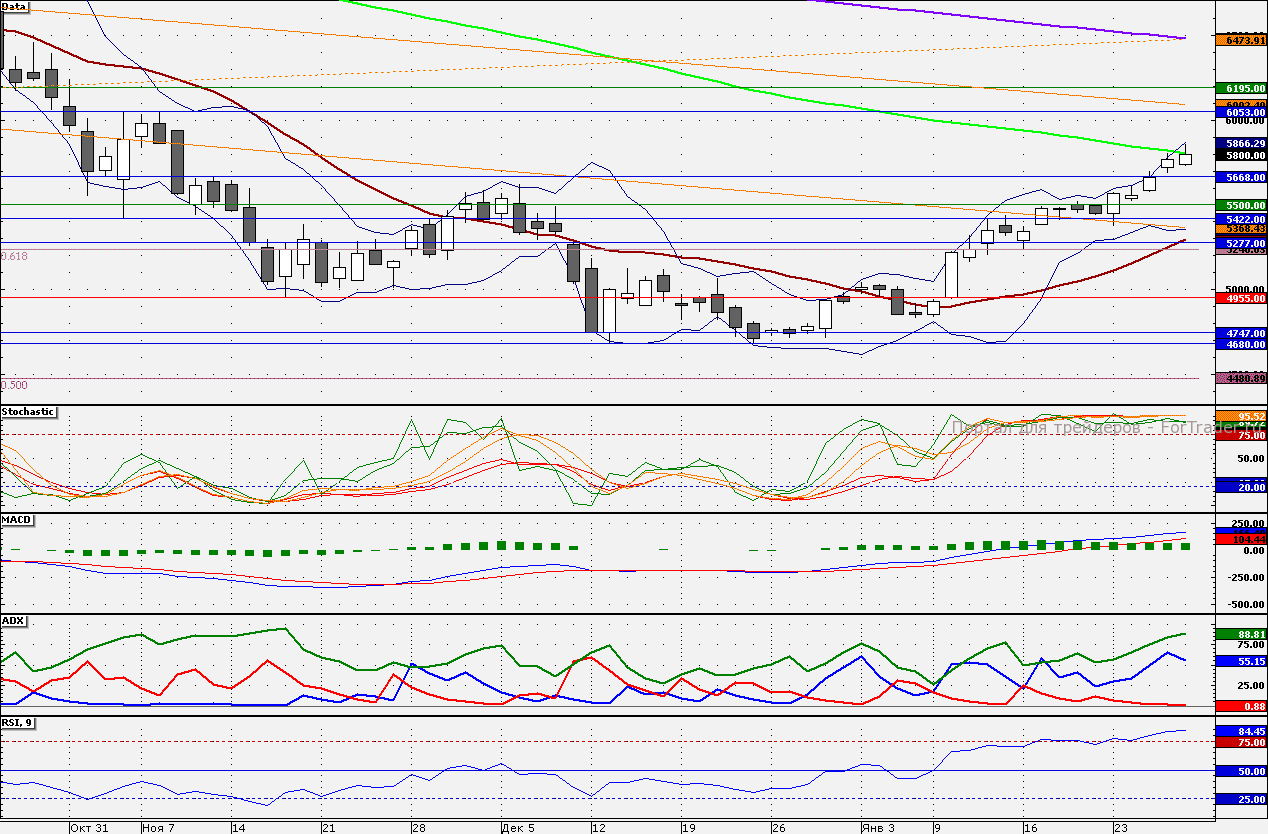 Акции компании закрылись на 100-дневной скользящей средней, от которой могут развернуться вниз уже сегодня. Поддержкой является отметка 5670 руб., от которой 26 января был сформирован гэп вверх, для его закрытия необходимо возвращение к данной отметке.