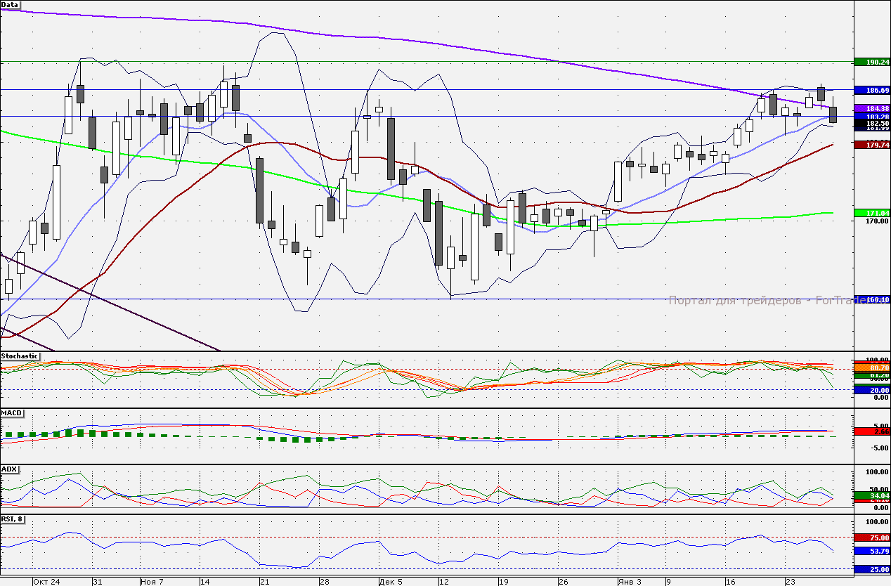 Акции компании в пятницу закрылись ниже 10-дневной скользящей средней, что располагает к продолжению распродаж с целью достижения 180 руб. Сопротивлением является отметка 183,33 руб.