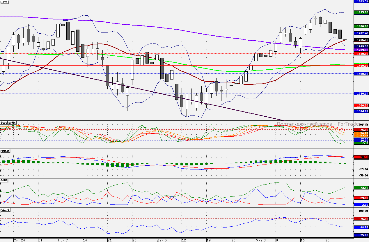 В пятницу акции «ЛУКОЙЛа» удержались выше 21-дневной скользящей средней, но внешний фон сегодня располагает к продолжению распродаж – 1750,00 руб. Сопротивлением является отметка 1780,00 руб.