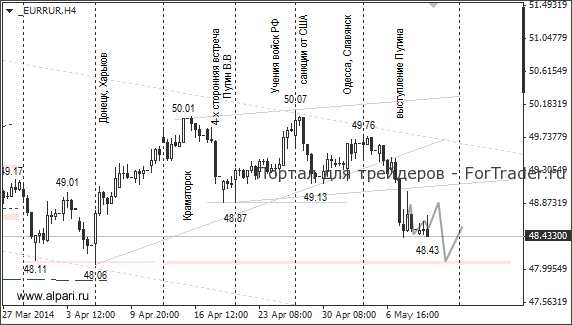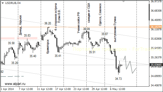 В среду курсы евро и доллара снизились по отношению к рублю В.В. Путина. Российский президент попросил киевские власти прекратить военную операцию и призвал представителей юго-востока Украины отложить намеченный на 11 мая референдум. В. Путина не послушали и 11 мая в Донецкой и Луганской областях Украины провели референдумы о статусе регионов. В четверг рубль отреагировал снижением на сообщение, что референдумы не отменят ни при каких обстоятельствах. Рублевые валютные пары евро/рубль и доллар/рубль мгновенно выросли на 50 и 35 копеек.