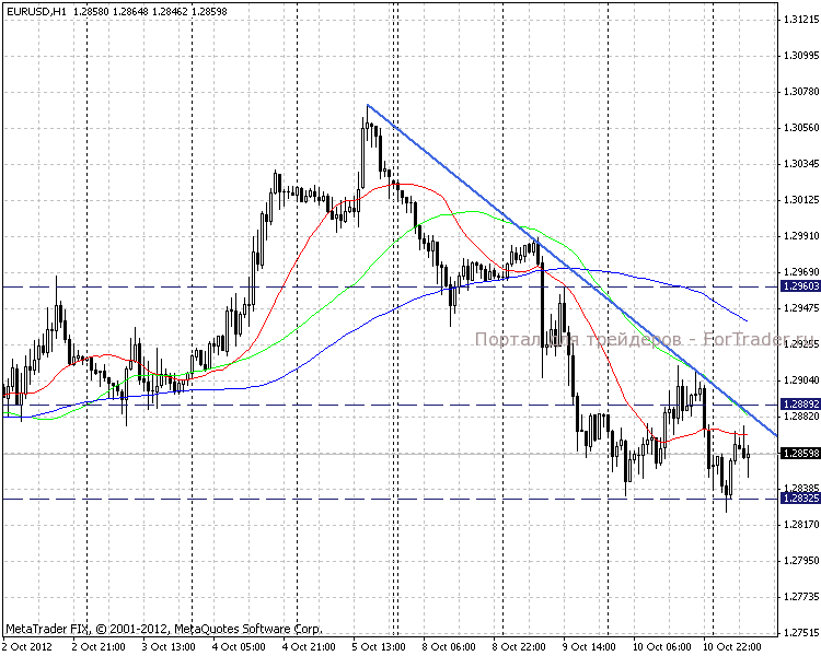 На дневных графиках курс валютной пары EUR/USD подошел к долгосрочной линии тренда, сильный уровень поддержки сформировался на отметке 1,2830. Угол наклона линий скользящих средних со временем увеличивается, что подтверждает силу «быков».