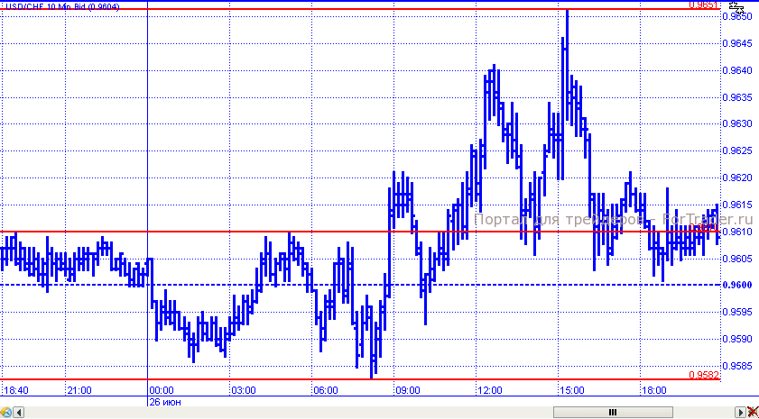 В начале торговых суток пара доллар/франк удерживалась в пределах узкого диапазона 0,9582 – 0,9610. После прорыва его верхней границы пара устремилась вверх и в рамках восходящего движения достигла внутридневного максимума на уровне 0,9651. Но развить восходящее движение ценам не удалось и к завершению дня пара вернулась к уровню поддержки 0,9610/0,9600.