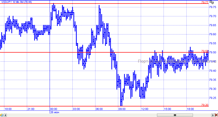 Во вторник пара доллар/иена в первой половине торговых суток продемонстрировала падение. От уровня сопротивления 79,80 цены устремились вниз и, хоть и не с первой попытки, но все же преодолели поддержку 79,50, после чего продолжили снижение к уровню 79,20. Но к завершению дня пара все же восстановила часть потерь и закрылась в районе уровня 79,50 (но уже как сопротивления).