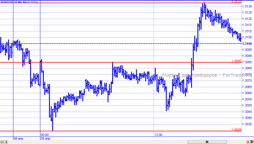 Новую неделю евро начал с падения под влиянием китайских данных. Пара снизилась до отметки 1,3029, которая и стала внутридневным минимумом. Впоследствии цены вернулись к уровню 1,3085 и какое-то время консолидировались в пределах диапазона 1,3050 – 1,3085. Но на американской сессии цены все же возобновили рост и поднялись к сопротивлению 1,3130, однако развить успех им не удалось и к завершению торговых суток пара вернулась к поддержке 1,3100.