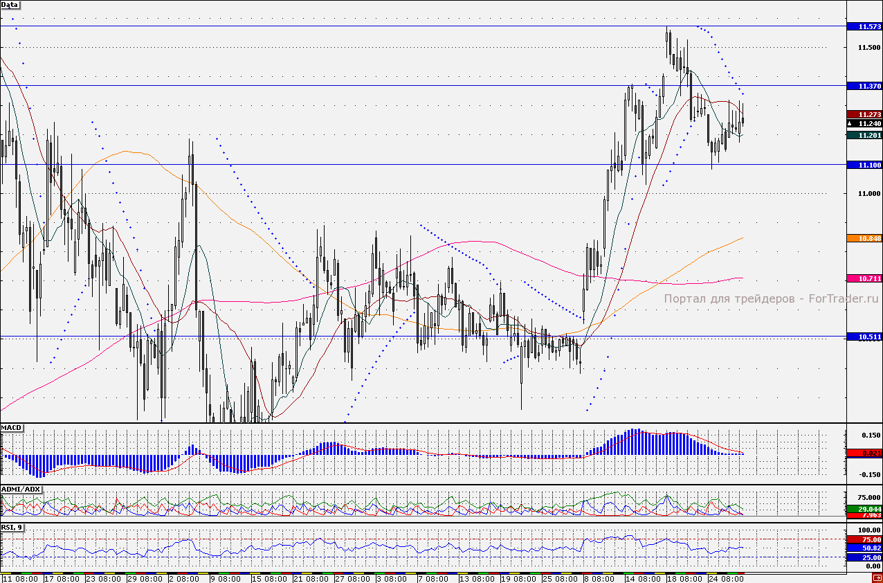 На четырех часовом графике акций ММК возможно формирование второго «плеча» фигуры разворота тренда – «голова плечи». Ближайшим сопротивлением для акций выступает вершина левого «плеча» — 11,37 руб., от данной отметки спекулятивные «лонги» стоит закрывать, поскольку в случае если от указанной отметки произойдет откат к линии «шеи» (11,10 руб.), с последующим пробоем, целью для акций выступит район 10,63 руб., равный высоте фигуры. Трендовые индикаторы свидетельствуют о слабости «быков». Сигнальная линия MACD(12;26;9) сверху вниз пересекает нулевую линию, что может свидетельствовать о возможном формировании коррекционного снижения. Также индикатор ADMI/ADX показывает, что силы «быков» на исходе (линия «быков» пока находится выше линии «медведей», однако, линия ADMI ушла ниже значения 30). Наш 30-минутный торговый робот пока находится в «лонгах» от отметки 11,16 руб., но уже готов изменить позиции. Таким образом, спекулятивные «лонги» от отметки 11,37 руб. стоит закрывать и открывать новые только в случае если формирование разворотной фигуры не подтвердиться и бумагам удастся закрепиться выше 11,37 руб.