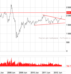 Развитие цен на акции ЛУКОЙЛа происходит согласно восходящей тенденции с конца 2008 года. Выход из фигуры продолжения вверх с подтверждением, после решения ФРС, дает нам новый ценовой ориентир фиксации прибыли в 2200 руб. за акцию.