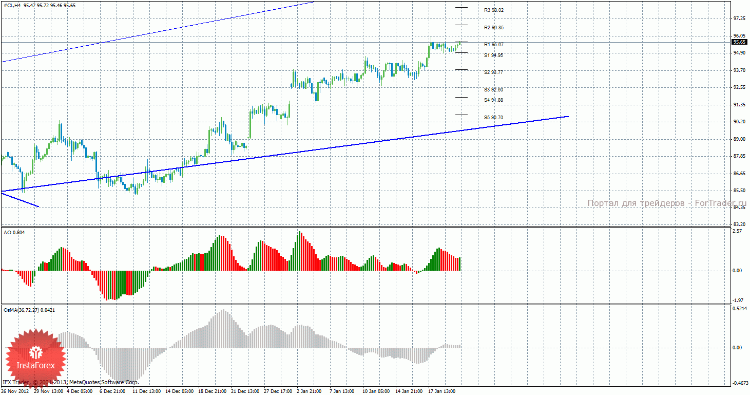 Анализ сырой нефти за 22 января показывает, что цена сейчас находится между уровнями S1 и R1 и не определилась еще с направлением торгов, волатильность понижена. Восходящая линия тренда продолжает поддерживать быков и выступает поддержкой восходящему движению. Таким образом, сейчас актуальны длинные позиции с целями R2 – 96,85 и R3 – 98,02, но для их открытия требуется закрепление цены выше уровня R1 — 95,67. Также возможно начало коррекционного движения с целями 93,77 и 92,60, если цена закрепиться ниже уровня S1 — 94,95. Индикатор Awesome показывает текущее нисходящее движение, так как последний закрытый бар красного цвета, что свидетельствует о коррекционном движении. OsMA же направлен наверх, что говорит о восходящем характере движения в более долгосрочном плане. Закрепление цены выше уровня 95,67 может спровоцировать продолжение восходящего движения.