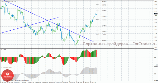 Анализ природного газа за 22 января показывает, что цена отработала уровень сопротивления 3,6010 и закрепилась выше него, поэтому восходящее движение может продолжиться. Сейчас актуально восходящее движение с целями 3,6970 и 3,7920. Целями для возможной нисходящей коррекции выступают уровни 3,5420 и 3,4470, если цена закрепиться ниже уровня 3,6010. Нисходящая линия тренда более не поддерживает медведей, так как цена закрепилась выше нее, а восходящую линию тренда построить пока что нельзя. Индикатор Awesome показывает локальное нисходящее движение, последний закрытый бар окрашен в красный цвет, нельзя исключать и того, что индикатор может разряжаться. OsMA также развернулся вниз, что сигнализирует о начале нисходящего движения цены на газ и в более долгосрочной перспективе. Отскок от уровня 3,6970 может спровоцировать начало коррекции. Оба индикатора сейчас перекуплены и скорее всего начали разряжаться.