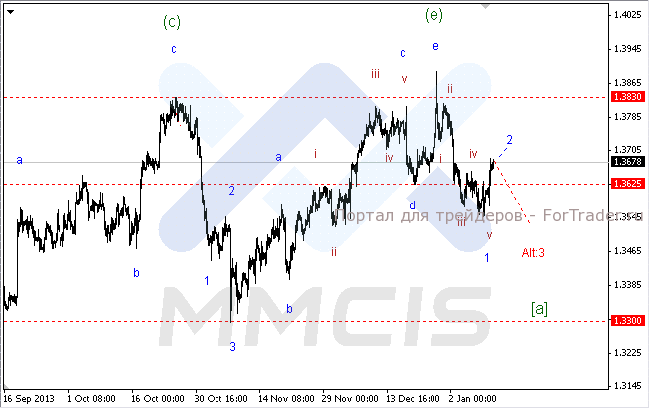 При этом в ближайшее время аналитики ожидают незначительного укрепления пары в рамках коррекционной волны «2». Целевым уровнем здесь может выступить отметка 1.3730, которая составляет 50% коррекции Фибоначчи от первой волны. Если же дальнейшего укрепления или консолидации пары вблизи отметки 1.3700 не последует, то в этом случае будем наблюдать начало формирования третьей волны нисходящего импульса [a] старшего порядка.