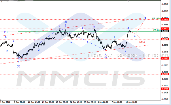 Поэтому сегодня в качестве основного сценария можно рассматривать частичное ослабление пары по направлению к уровню 1.3200, в виде коррекционной волны «1» младшего порядка.