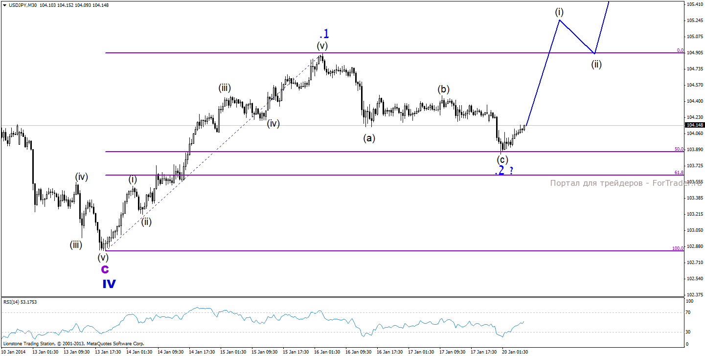 В рамках коррекции .2 пара снизилась до первого целевого уровня 103.90, однако опуститься ниже него не удалось. Можно предположить, что волна .2 была завершена, следовательно, ждем возобновления роста по направлению к 105.20.