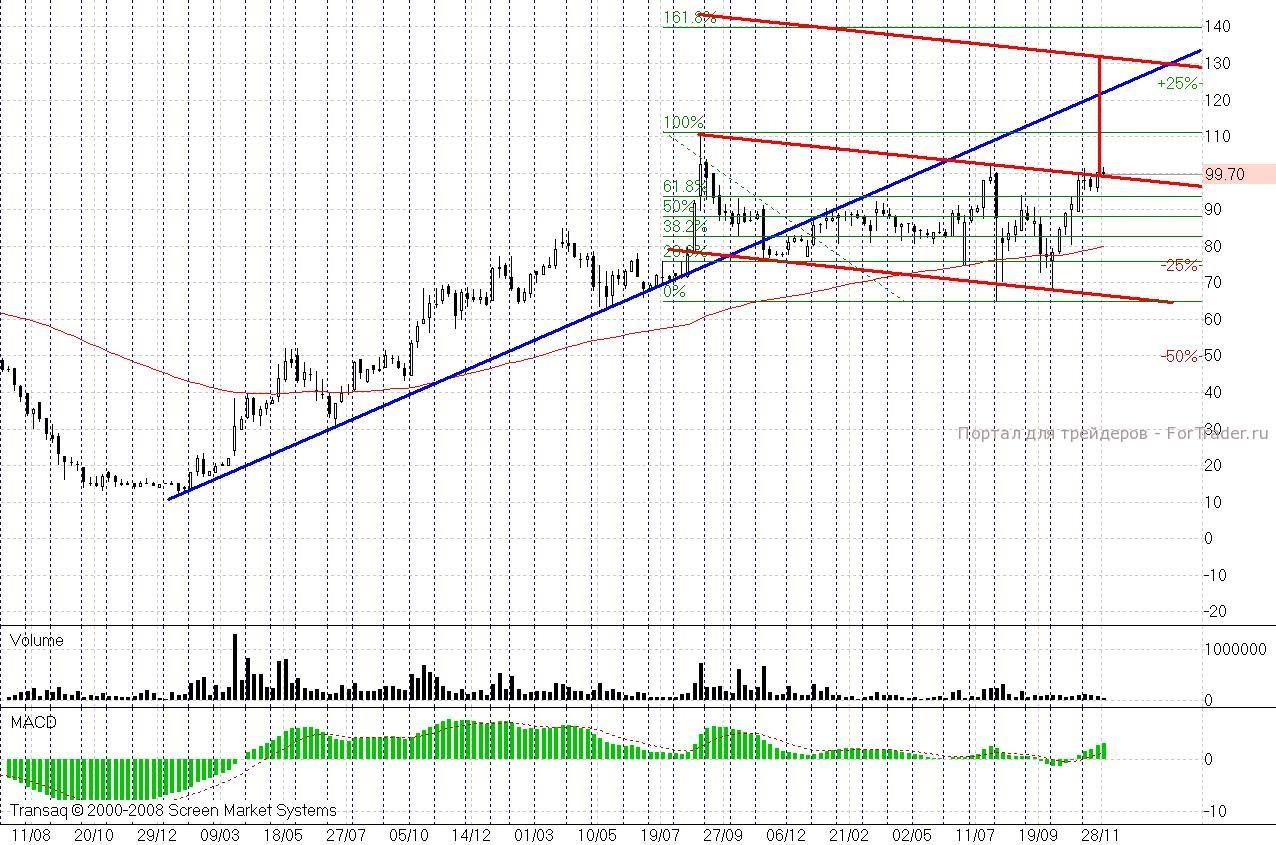 Привилегированные акции «Ростелекома», вышли из долгосрочной консолидации. Я даже не могу из-за слишком умеренного угла наклона назвать движение бумаг с сентября 2010 года по ноябрь 2011 года настоящим нисходящим трендом. Бумаги эти — для терпеливых трейдеров. В принципе, после пробоя 100 рублей для них открываются цели 110 и даже 130 рублей, но быстро поход осуществить у акций не получится. Их будет угнетать то, что эти цели выше исторических хаев. Но эти бумаги по технике лучше индекса ММВБ, и значит, основных бумаг, над которыми есть явные нисходящие тренды.