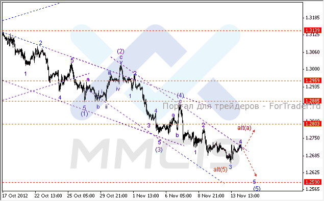Исходя из этого, в качестве основного сценария на сегодня аналитики рассматривают возможность дальнейшего укрепления пары в направлении 28-й фигуры в качестве коррекционной волны «4».Однако нельзя исключать вероятность того, что четвертая волна завершится вблизи верхней границы канала на уровнях 1.2730-1.2740. В таком случае, после достижения этих уровней пара возобновит нисходящее движение в направлении отметки 1.2616 в качестве волны «5».