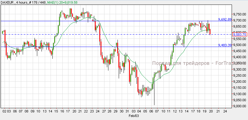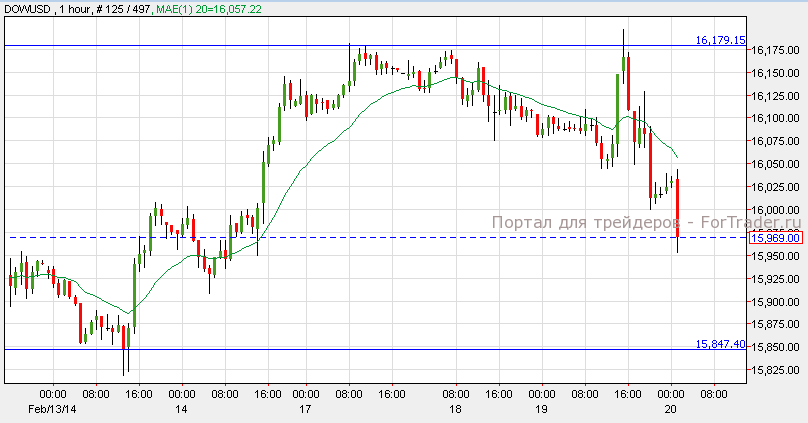 Американские индексы упали в следствии того, что Комитет по операциям на открытом рынке до сих пор не утвердил процентные ставки. S&P 500 упал на 0.65%, NASDAQ упал на 0.72%, а Dow Jones потерял от стоимости 0.56%. Акции Facebook упали на 2.50% несмотря на то, что компания купила программу WhatsApp за 16 миллиардов долларов. Dow Jones торгуется на уровне сопротивления 16,175 и поддерживает нисходящий импульс. Согласно анализу 1-часового графика, индекс может достичь уровня поддержки 15,850 а потом начать откат к отметке 16,000.
