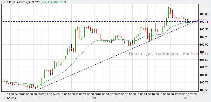 Нефть подешевела до $102.75 за баррель. Согласно анализу получасового графика, нефть торгуется с восходящим импульсом. Прорыв уровня поддержки $102.00 может привести чёрное золото к отметке $100. Этот уровень может так же вызвать рост к отметке $105. Сегодня импульс нефти определится точнее после выхода данных о запасе сырой нефти.