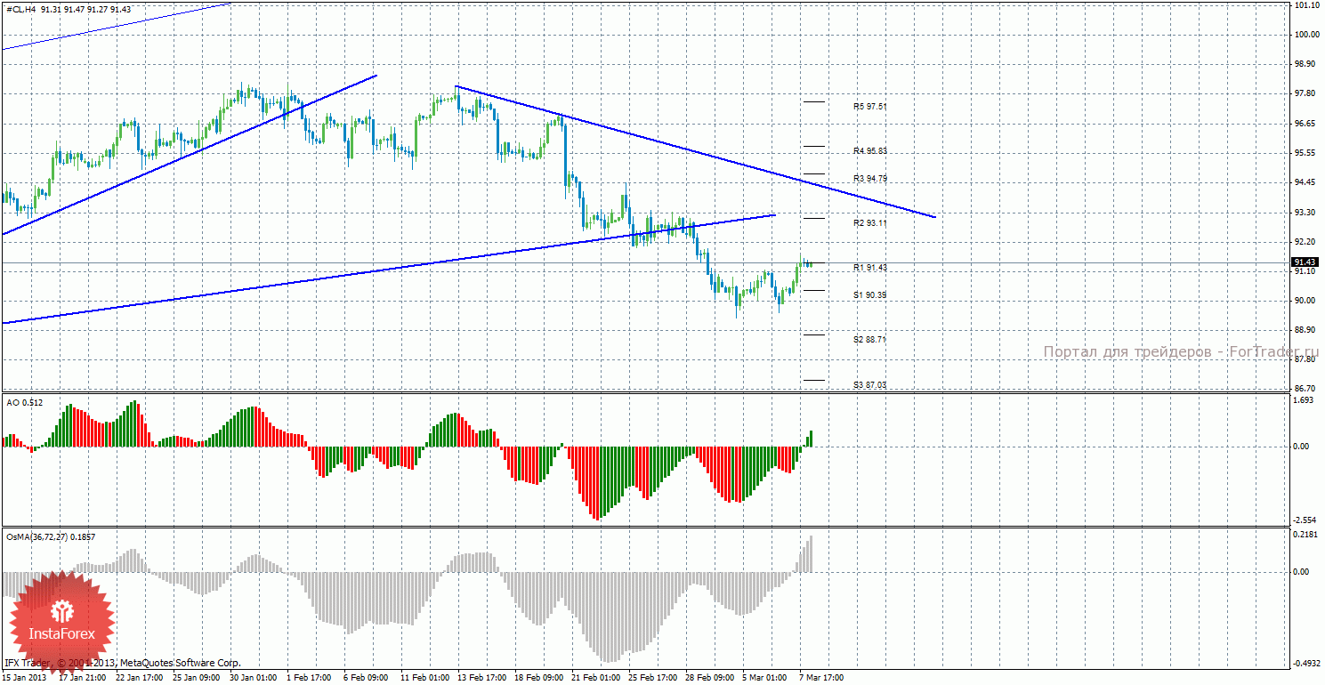 В ходе проведенного анализа движения цены на нефть можно сделать вывод, что сейчас можно рассматривать короткие позиции с целями 90,39 и 88,71. Стоп-лосс выставляем выше ближайшего уровня сопротивления. При заходе сделки в прибыльность в безубыток. Разворот Awesome или OsMA вниз может просигнализировать о возобновлении нисходящего движения, так же как и отскок цены от уровня 91,43. Длинные позиции сейчас рассматривать не рекомендуется.