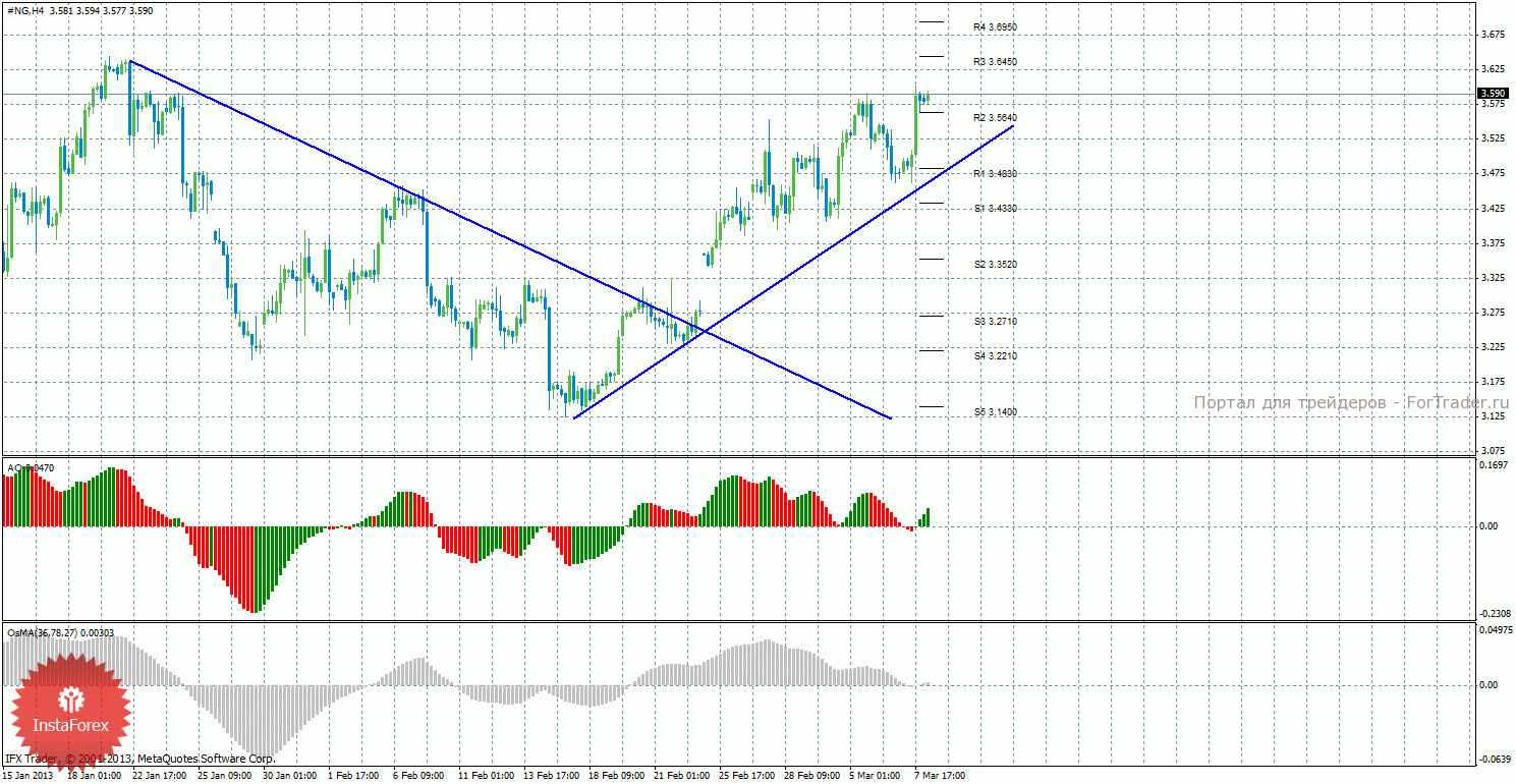 Анализ природного газа за 8 марта показывает, что цена завершила коррекцию и возобновила восходящее движение и закрепилась выше уровня сопротивления 3,5640. Сейчас актуально восходящее движение с целями 3,6450 и 3,6950, если цена останется выше уровня 3,5640. Целями для возможной нисходящей коррекции выступают уровни 3,4830 и 3,4330, если цена закрепится ниже уровня 3,5640. Нисходящая линия тренда больше не поддерживает медведей, а новая восходящая линия тренда оказывает поддержку быкам. Индикатор Awesome показывает локальное восходящее движение, последний закрытый бар окрашен в зеленый цвет, что говорит в пользу продолжения восходящего движения. OsMA также развернулся наверх, что сигнализирует о восходящем движении цены на газ и в более долгосрочной перспективе. Закрепление цены ниже уровня 3,5640 может спровоцировать начало нового витка коррекции. Если цена закрепится ниже восходящей линии тренда, то на рынке может произойти смена тенденции.