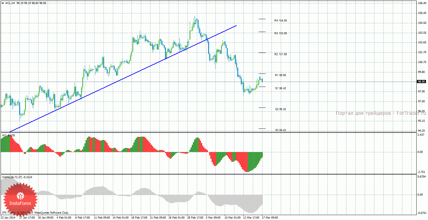 Анализ сырой нефти за 17 марта показывает, что цена находится в начале новой недели между уровнями S1 и R1 и корректируется, о чем сигнализируют оба индикатора. Нисходящее движение может продолжиться с целями S2 – 96,42 и S3 – 94,42, если цена закрепится ниже уровня 98,42. Может продолжиться восходящая коррекция с целями 101,66 и 103,66, в случае, если цена закрепится выше уровня 99,66. Восходящая линия тренда больше не оказывает поддержку торгующим на повышение, цена располагается ниже нее, поэтому сейчас стали актуальными короткие позиции. Индикатор Awesome показывает текущее восходящее движение, так как последний закрытый бар зеленого цвета. OsMA также направлен наверх, что говорит о восходящем характере движения и в более долгосрочном плане. Если цена закрепится ниже уровня 98,42, это может засвидетельствовать продолжение нисходящего движения.
