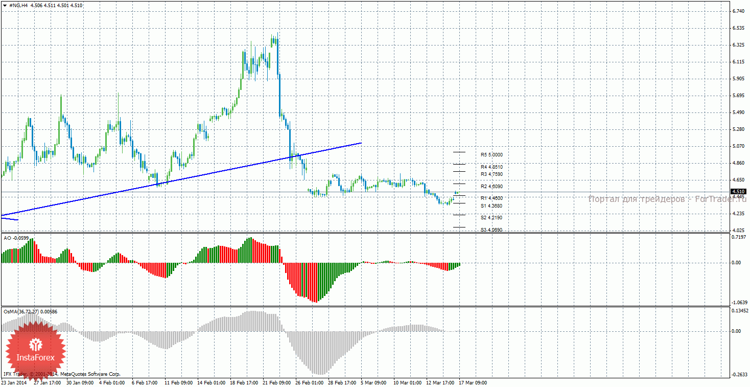Анализ природного газа за 17 марта показывает, что цена начала виток коррекционного движения, а в целом все движение сейчас очень слабое. На данный момент актуально нисходящее движение с целями уровни поддержки S1 – 4,3680 и S2 – 4,2190, если цена закрепится ниже уровня 4,4600. Целями для возможной восходящей коррекции выступают уровни сопротивления 4,6090 и 4,7590, если цена останется выше уровня 4,4600. Цена закрепилась ниже восходящей линии тренда, поэтому она более не актуальна, тенденция на рынке поменялась на нисходящую. Нисходящей линии тренда пока что нет. Индикатор Awesome показывает локальное восходящее движение, последний закрытый бар окрашен в зеленый цвет. OsMA также направлен вверх, что сигнализирует о восходящем движении цены на газ и в более долгосрочной перспективе.