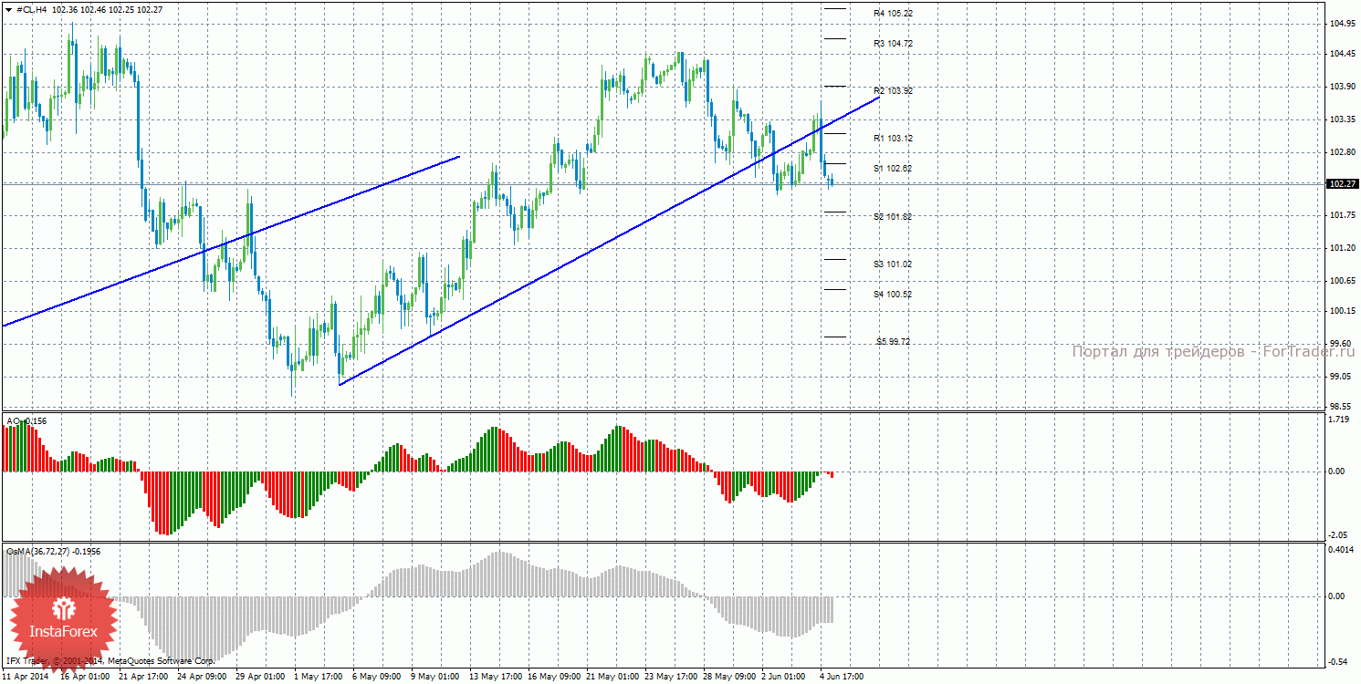 Анализ сырой нефти за 5 июня показывает, что цена скорректировалась и возобновила нисходящее движение, закрепившись ниже уровня 102,62. Нисходящее движение может продолжиться с целями S2 – 101,82 и S3 – 101,02, если цена останется ниже уровня 102,62. Может начаться новый виток восходящей коррекции с целями уровни 103,12 и 103,92, если цена закрепится выше уровня 102,62. Восходящая линия тренда больше не поддерживает торгующих на повышение, цена закрепилась ниже нее, поэтому сейчас актуальны короткие позиции и нисходящее движение. Индикатор Awesome показывает текущее нисходящее движение, так как последний закрытый бар красного цвета. OsMA направлен вверх, что говорит о восходящем характере движения в более долгосрочном плане. Отскок цены от уровня 101,82 может спровоцировать начало коррекционного движения.