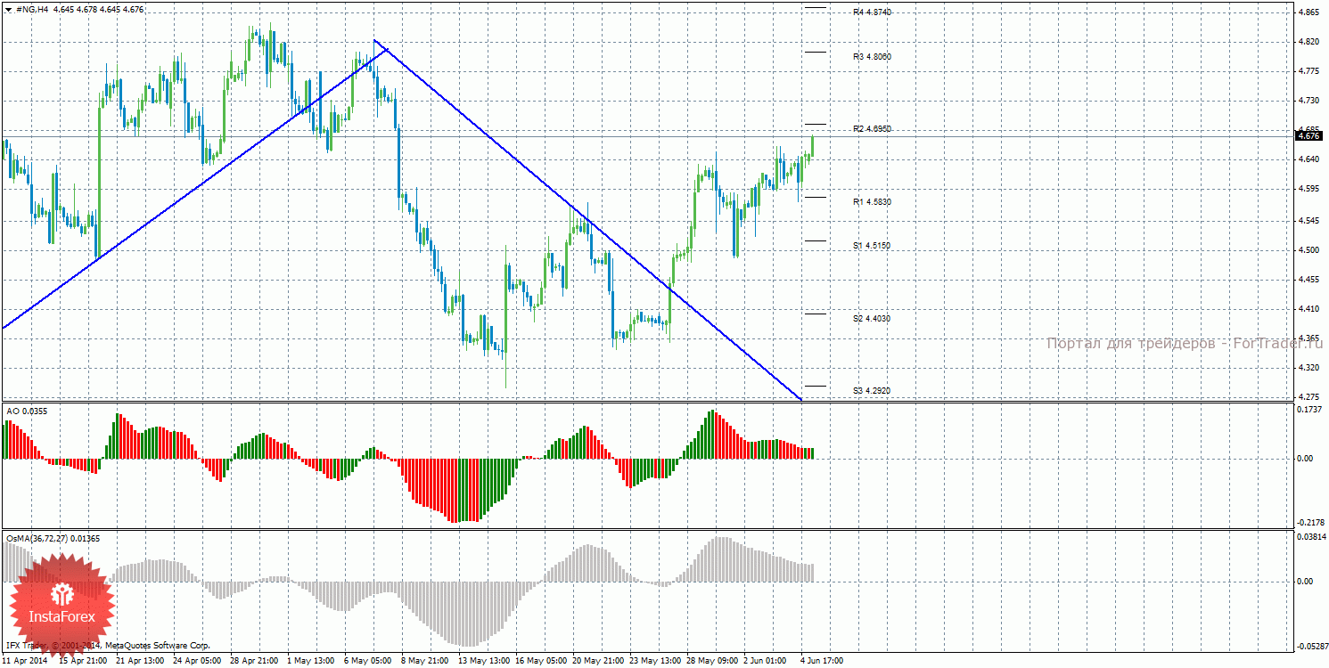 Анализ природного газа за 5 июня показывает, что цена продолжает восходящее движение, а оба индикатора продолжают разряжаться. На данный момент актуально восходящее движение с целями уровни сопротивления R2 – 4,6950 и R3 – 4,8060. Целями для нисходящей коррекции выступают уровни 4,5830 и 4,5150, если цена отскочит от уровня 4,6950. Цена закрепилась выше нисходящей линии тренда, поэтому нисходящее движение сейчас не актуально и можно рассматривать ордера на покупку. Индикатор Awesome показывает локальное нисходящее движение, последний закрытый бар окрашен в красный цвет. OsMA также направлен вниз, что сигнализирует о нисходящем движении цены на газ и в более долгосрочной перспективе. Оба индикатора сейчас разряжаются. Отскок цены от уровня 4,6950 может спровоцировать виток нисходящей коррекции.