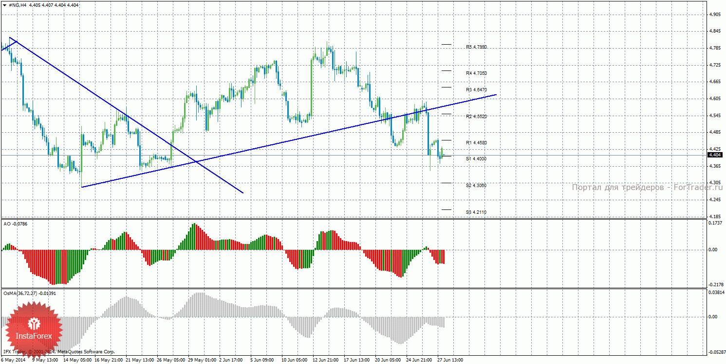Анализ природного газа за 30 июня показывает, что цена возобновила нисходящее движение и отработала уровень 4,4000, который пока не преодолен. На данный момент актуально нисходящее движение с целями уровни поддержки S2 – 4,3060 и S3 – 4,2110, если цена закрепится ниже уровня 4,4000. Целями для начала восходящей коррекции выступают уровни 4,4580 и 4,5520, если цена отскочит от уровня 4,4000. Восходящая линия тренда больше не оказывает поддержку торгующим на повышение, цена закрепилась ниже нее, поэтому сейчас являются актуальными короткие позиции. Индикатор Awesome показывает локальное нисходящее движение, последний закрытый бар окрашен в красный цвет. OsMA также направлен вниз, что сигнализирует о нисходящем движении цены на газ и в более долгосрочной перспективе. Отскок цены от уровня 4,4000 может спровоцировать виток коррекционного движения.