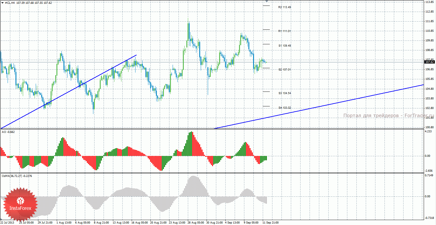 Анализ сырой нефти за 12 сентября показывает, что цена отработала уровень поддержки S2 – 107,01, но преодолеть его не смогла, поэтому сейчас может попытаться возобновиться восходящее движение. Сейчас актуальны длинные позиции с целями S1 – 109,49 и R1 – 111,01, если цена отскочит от уровня 107,01. Может продолжиться нисходящее коррекционное движение с целями 104,54 и 103,02, если цена закрепится ниже уровня 107,01. Долгосрочная восходящая линия тренда оказывает поддержку восходящему движению, однако, цена находится довольно далеко от нее. Индикатор Awesome показывает текущее восходящее движение, так как последний закрытый бар зеленого цвета. OsMA же направлен вниз, что говорит о нисходящем характере движения в более долгосрочном плане. Если цена отскочит от уровня 107,01, это может спровоцировать возобновление восходящего движения.