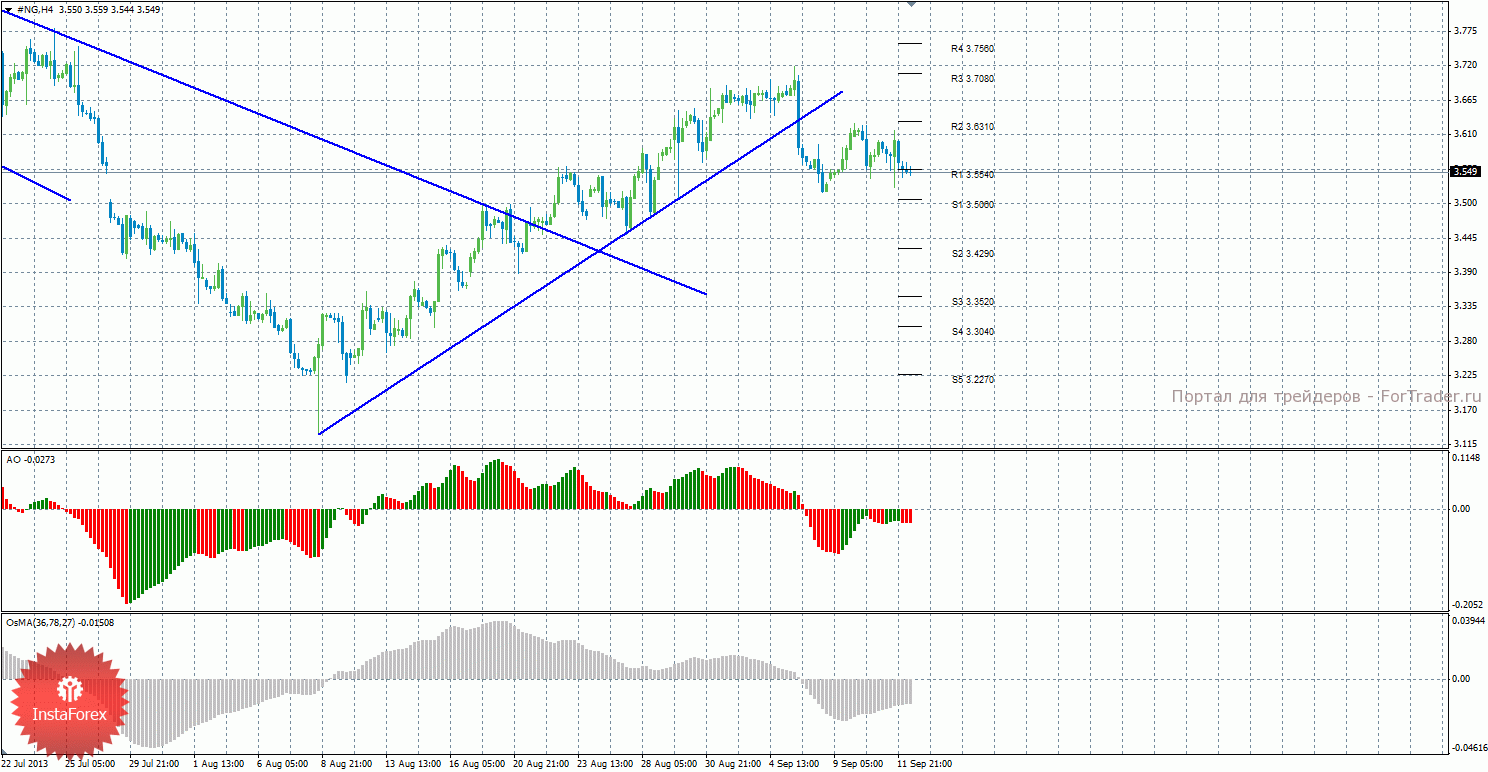 Анализ природного газа за 12 сентября показывает, что цена закрепилась ниже восходящей линии тренда, но никак не может преодолеть уровень 3,5540 и может начать новый виток коррекции. На данный момент актуально нисходящее движение с целями уровни поддержки S1 — 3,5060 и S2 – 3,4290, если цена закрепится ниже уровня 3,5540. Целями для возможной восходящей коррекции выступают уровни 3,6310 и 3,7080, если цена останется выше уровня 3,5540. Восходящая линия тренда больше не оказывает поддержку торгующим на повышение, нисходящей линии тренда пока что нет. Индикатор Awesome показывает локальное нисходящее движение, последний закрытый бар окрашен в красный цвет. OsMA же направлен вверх, что сигнализирует о восходящем движении цены на газ в более долгосрочной перспективе. Если цена закрепится ниже уровня 3,5540, это может спровоцировать продолжение нисходящего движения.