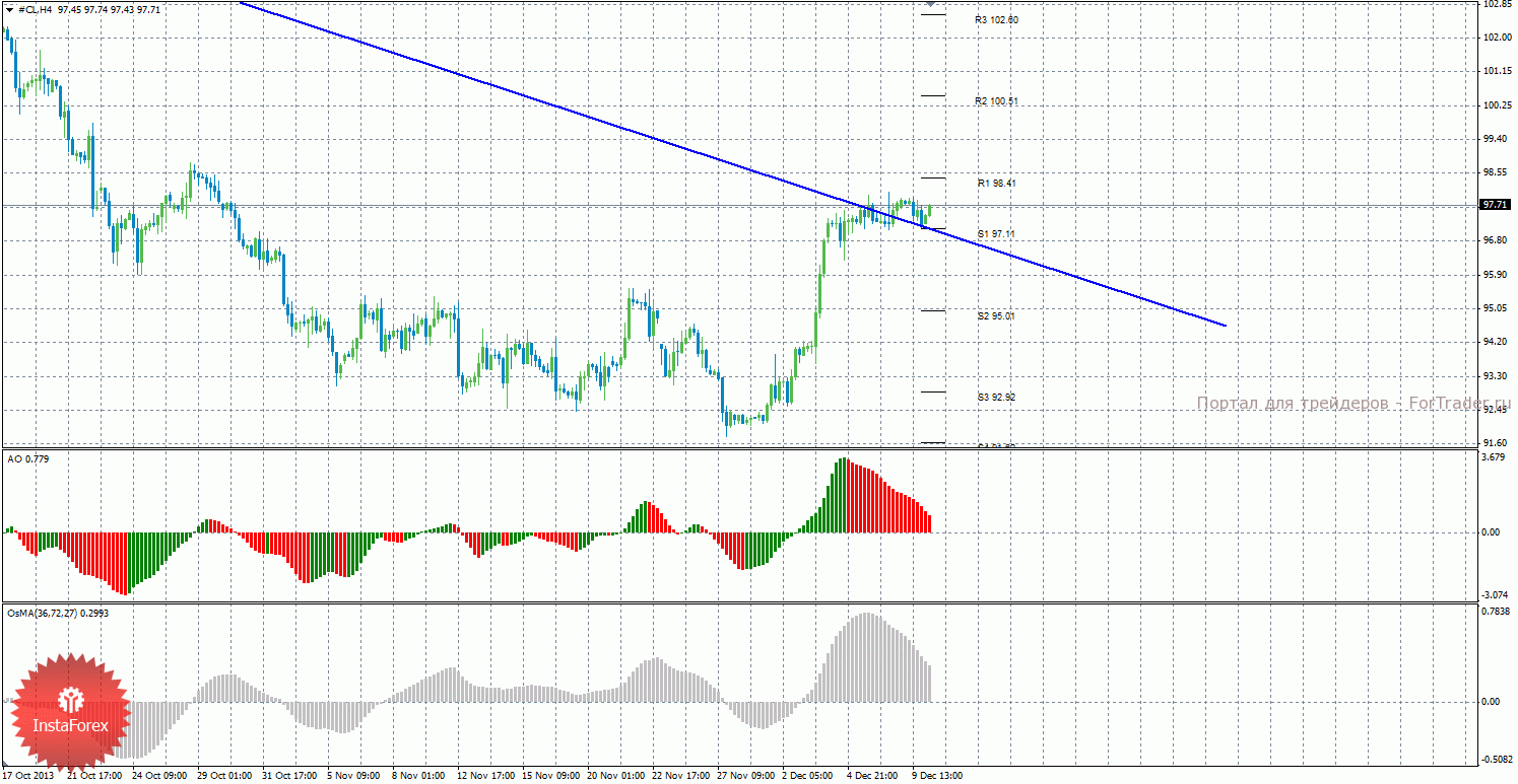 Анализ сырой нефти за 10 декабря показывает, что цена закрепилась выше нисходящей линии тренда, поэтому сейчас актуальны длинные позиции и восходящее движение. Восходящее движение может продолжиться с целями R2– 100,51 и R3 – 102,60, если цена закрепится выше уровня 98,41. Может начаться нисходящая коррекция с целями 95,01 и 92,92, в случае, если цена закрепится ниже уровня 97,11. Нисходящая линия тренда больше не оказывает поддержку торгующим на понижение, так как цена закрепилась выше нее. Индикатор Awesome показывает текущее нисходящее движение, так как последний закрытый бар красного цвета. OsMA также направлен вниз, что говорит о нисходящем характере движения и в более долгосрочном плане. Оба индикатора сейчас разряжаются, так как цена вниз не двигается. Отскок цены от уровня сопротивления 98,41 может спровоцировать виток нисходящей коррекции.