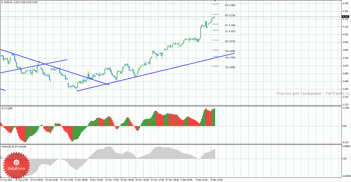 Анализ природного газа за 10 декабря показывает, что цена продолжает восходящее движение и преодолела уровень сопротивления R1 – 4,1590, оба индикатора время от времени разряжаются. На данный момент актуально восходящее движение с целями уровни сопротивления R2 — 4,2740 и R3 – 4,3900. Целями для возможного начала нисходящей коррекции выступают уровни поддержки 4,1590 и 4,0870, если цена отскочит от уровня 4,2740. Восходящая линия тренда оказывает поддержку торгующим на повышение, ниже нее цена закрепиться пока не смогла. Индикатор Awesome показывает локальное восходящее движение, последний закрытый бар окрашен в зеленый цвет. OsMA также направлен вверх, что сигнализирует о восходящем движении цены на газ и в более долгосрочной перспективе. Отскок от уровня 4,2740 может спровоцировать виток нисходящей коррекции. Оба индикатора могут начать разряжаться в любой момент, так как находятся на максимальных позициях.