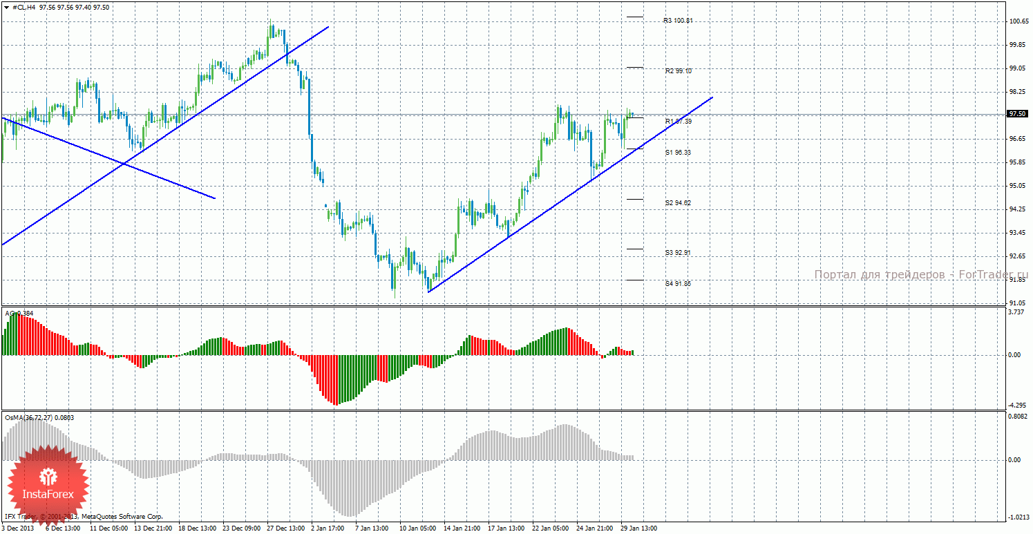 Анализ сырой нефти за 30 января показывает, что цена продолжает восходящее движение, построена восходящая линия тренда, оказывающая поддержку торгующим на повышение. Восходящее движение может продолжиться с целями R2 – 99,10 и R3 – 100,81, если цена останется выше уровня 97,39. Может начаться нисходящая коррекция с целями 96,33 и 94,62, в случае, если цена закрепится ниже уровня 97,39. Восходящая линия тренда оказывает поддержку торгующим на повышение, если цена закрепится ниже нее, то тенденция на рынке может поменяться на нисходящую. Индикатор Awesome показывает текущее нисходящее движение, так как последний закрытый бар красного цвета. OsMA направлен вниз, что говорит о нисходящем характере движения и в более долгосрочном плане. Если цена закрепится ниже уровня 97,39, это может засвидетельствовать попытку возобновления нисходящего движения или коррекции.