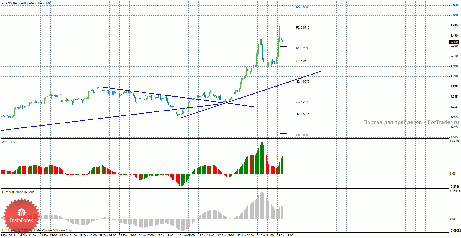 Анализ природного газа за 30 января показывает, что цена отработала уровень сопротивления 5,6730 и отскочила от него, начав нисходящее коррекционное движение. На данный момент актуально восходящее движение с целями уровни сопротивления R2 — 5,6730 и R3 – 6,0580, если цена отскочит от уровня 5,2890. Целями для возможного продолжения нисходящей коррекции выступают уровни поддержки 5,0510 и 4,6670, если цена закрепится ниже уровня 5,2810. Построена восходящая линия тренда, которая оказывает поддержку торгующим на повышение. Индикатор Awesome показывает локальное восходящее движение, последний закрытый бар окрашен в зеленый цвет. OsMA также направлен вверх, что сигнализирует о восходящем движении цены на газ и в более долгосрочной перспективе. Оба индикатора не среагировали вовремя на коррекцию. Если цена отскочит от уровня 5,2890, это может спровоцировать возобновление восходящего движения.