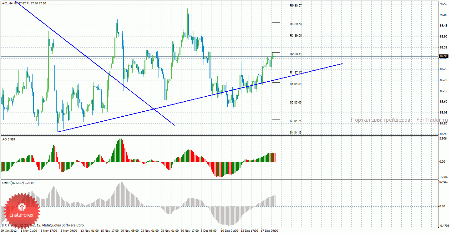 Анализ сырой нефти за 19 декабря показывает, что цена находится выше восходящей линии тренда, поэтому инструмент может продолжить восходящее движение. Восходящая линия тренда вновь поддерживает быков и выступает им поддержкой, но закрепление цены ниже нее может быть повторным сигналом к смене тенденции на рынке. Таким образом, сейчас актуальны длинные позиции с целями R2 – 88,11 и R3 – 89,05, первый из которых уже отработан. Также возможно возобновление нисходящего движения с целями 87,17 и 86,59, но только в случае отскока цены от уровня 88,11. Индикатор Awesome показывает текущее нисходящее движение, так как последний закрытый бар красного цвета. OsMA же направлен вверх, что говорит о восходящем характере движения в более долгосрочном плане.