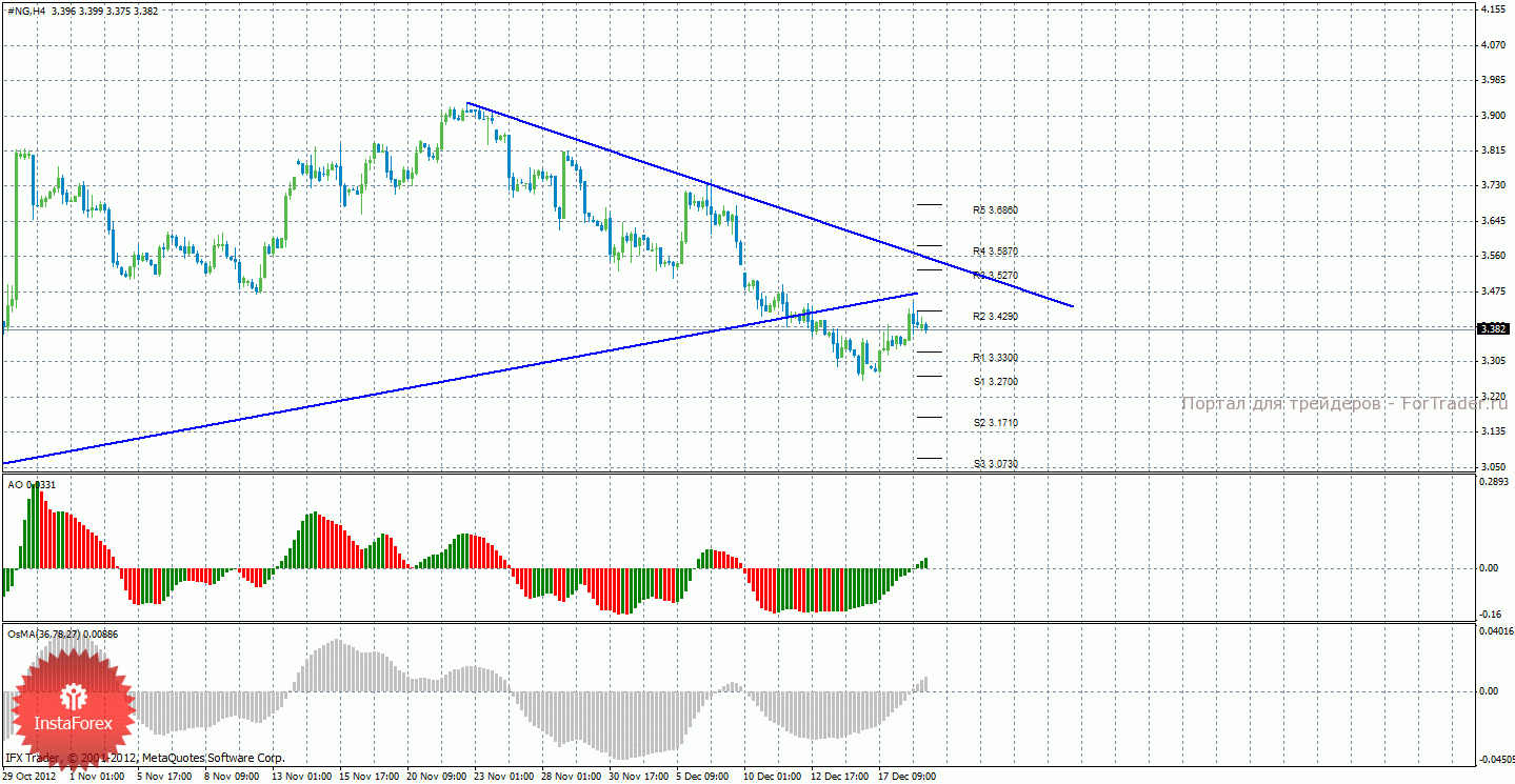 Анализ природного газа за 19 декабря показывает, что цена сохраняет перспективы нисходящего движения, но при этом продолжает корректироваться уже несколько дней. Cейчас актуально нисходящее движение с целями 3,3300 и 3,2700, но только в случае отскока цены от уровня 3,4290. Целями для начала восходящей коррекции выступают уровни 3,4290 и 3,5270. Восходящая линия тренда больше не поддерживает торгующих на повышение, так как цена закрепилась ниже нее, зато сформировалась новая нисходящая линия тренда, которая уже оказывает поддержку медведям. Индикатор Awesome показывает локальное восходящее движение, последний закрытый бар окрашен в зеленый цвет, что свидетельствует о коррекционном движении. OsMA также направлен вверх, что сигнализирует о восходящем движении цены на газ и в более долгосрочной перспективе.
