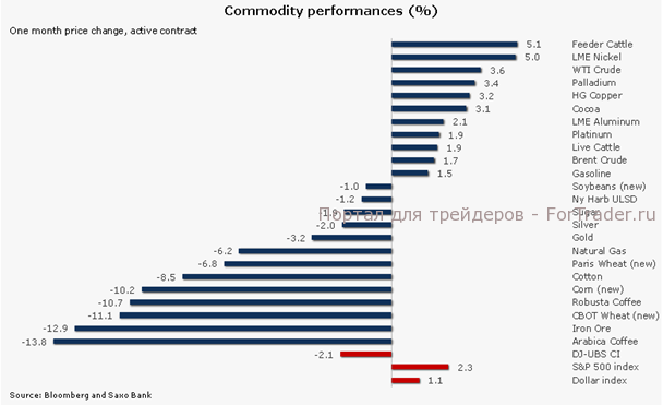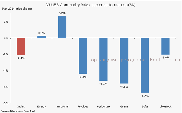 Сырьевой индекс DJ-UBS Commodity Index закончил месяц в минусе впервые с ноября, поскольку сельскохозяйственный сектор вернул часть позиций, завоеванных ранее в этом году. Промышленные металлы уверенно росли второй месяц подряд, а драгоценные металлы не нашли поводов для роста, поскольку акции и доллар заметно укрепляли позиции. Ситуация в секторе энергоносителей почти не изменилась, поскольку рост цен на сырую нефть WTI компенсировало падение цен на природный газ.