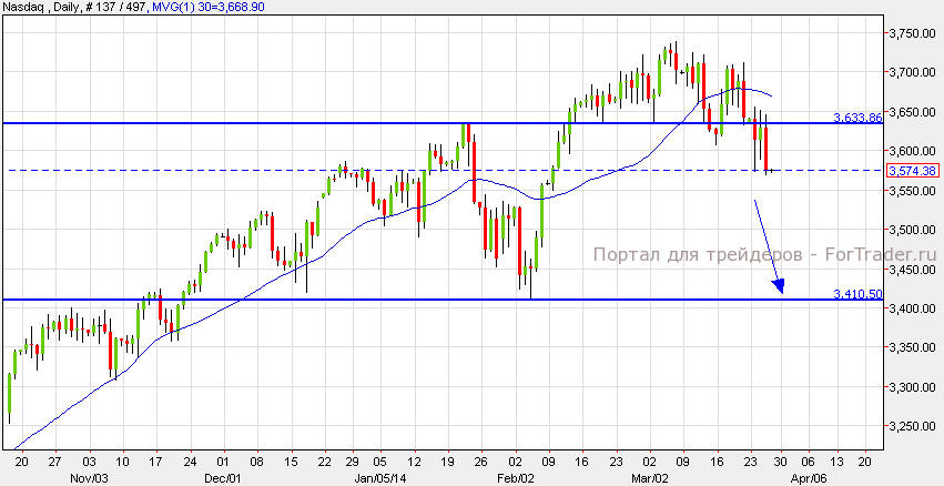 В среду Уолл-стрит завершила торговый день в красной зоне, так как заявление президента США о дальнейшем введении санкций против России вызвало снижение акций. S&P 500 снизился на 0.70%, NASDAQ упал на 1.29%, a Dow Jones упал на 0.60%. Согласно техническому анализу дневного графика, NASDAQ пробил уровень поддержки 3,633 и торгуется с нисходящим импульсом к следующему уровню поддержки на отметке 3,410. Индикатор скользящей средней также поддерживает нисходящий тренд.