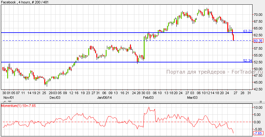 Акции Facebook упали на 6.94% после приобретения компании Oculus. Согласно техническому анализу 4-часового графика, акции Facebook торгуются с нисходящим трендом. Если цена опустится ниже уровня поддержки 63.20, она может продолжить падение к следующему уровню поддержки 52.00.