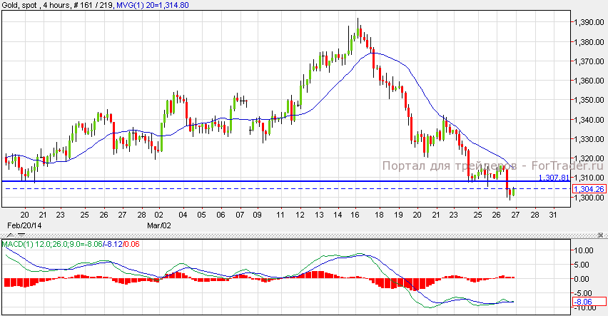 Золото подешевело на 0.24% составив $1,307 за унцию. Согласно техническому анализу 4-часового графика, золото пробило уровень поддержки 1,307 и движется к следующему уровню поддержки 1,300. Прорыв ниже уровня 1,300 может привести драгоценный металл к отметке 1,270. Индикатор скользящей средней и индикатор MACD также поддерживает нисходящий тренд.