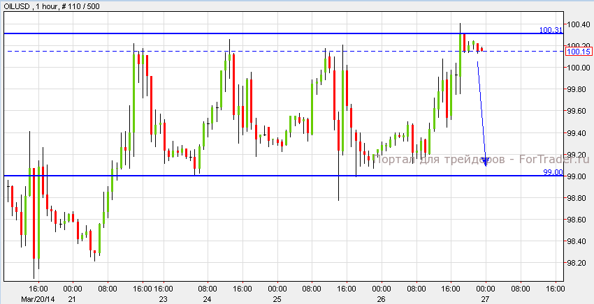 Нефть подорожала на 0.90% составив $100.17 за баррель после выхода Запасов сырой нефти с показателями 6.6 млн против 2.9 млн прогнозируемых. Согласно техническому анализу 1-часового графика, нефть торгуется в канале между уровнем поддержки 99.00 и уровнем сопротивления 100.30. Черное золото останется в этом канале если не пробъет уровень сопротивления или же уровень поддержки. Прорыв уровня сопротивления может вновь привести нефть к отметке 102.